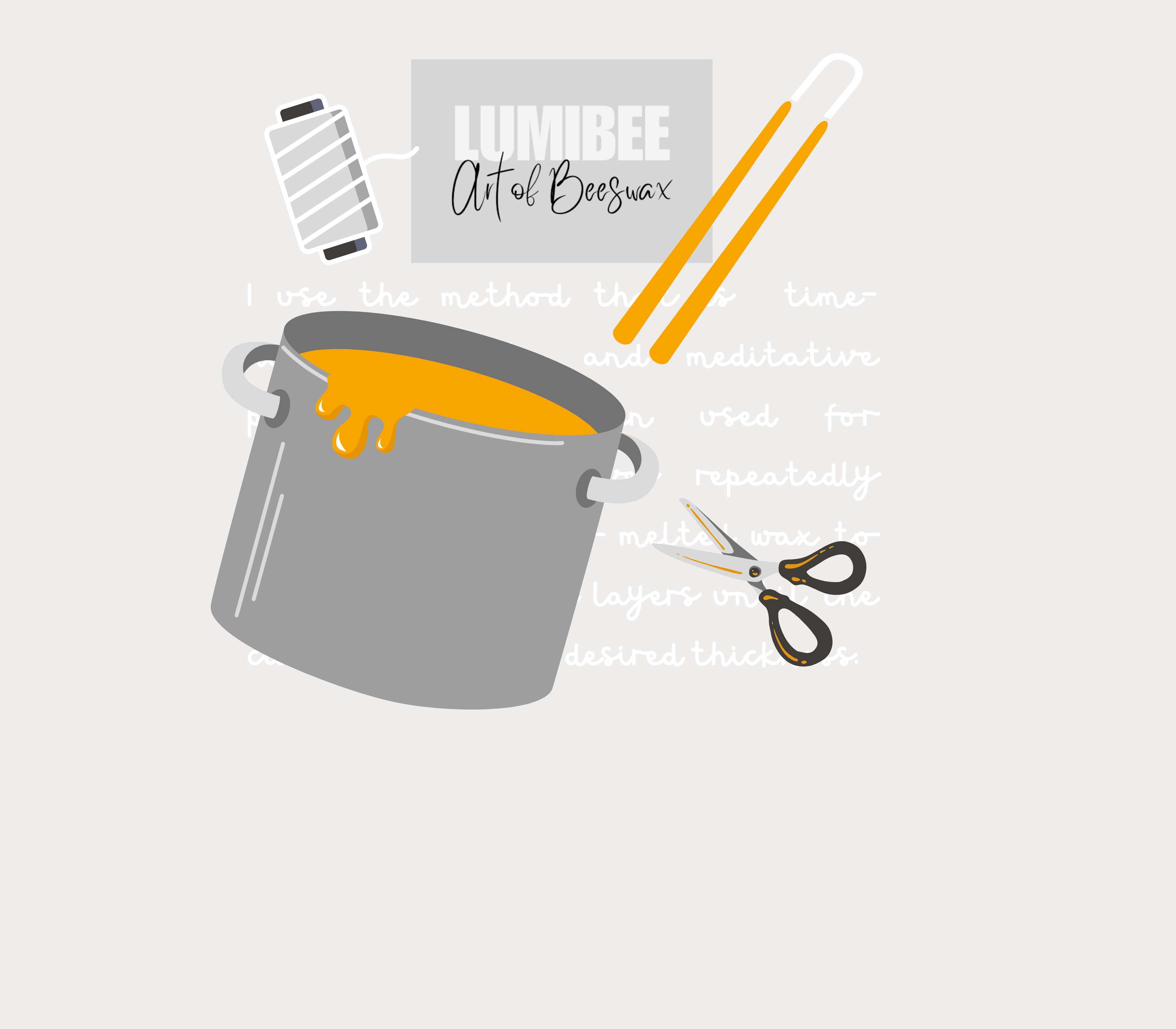 Welcome to Lumibee Studio. My name is Elsie-May Hanna and I am an artisan candle maker. I create all my beeswax crafts out of a dedicated studio based in my family homestead in Harkaway Victoria, Australia. I began exploring the process of purifying beeswax in 2020 as an effective way not to dispose waste after harvesting honey from our beehives. Candle making naturally became a passion which then developed with the hand dipped taper and then onto other beeswax crafts.